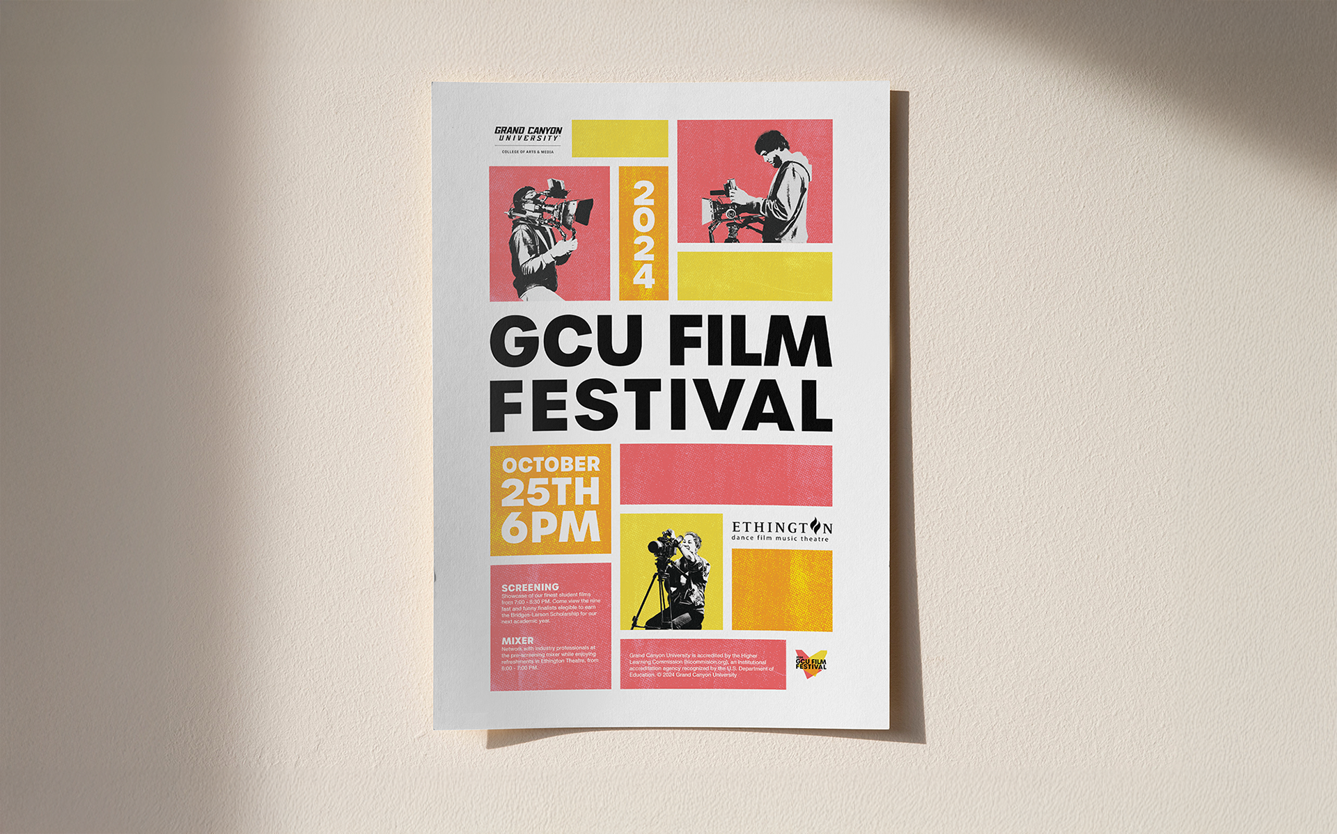 The Grand Canyon University (GCU) 2024 Film Festival poster served as one of the Film Department’s key promotional pieces for the university’s annual celebration of student filmmaking. Designed to capture the excitement and creativity of the event, the poster was widely distributed across GCU’s campus, helping to generate awareness and engagement. My work on this project involved developing a visually compelling design that reflected the festival’s dynamic energy while maintaining brand consistency.